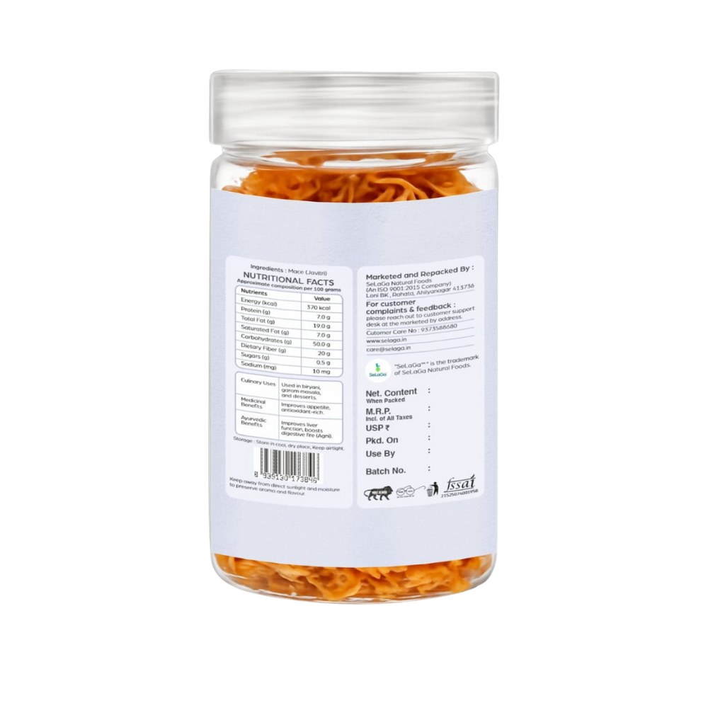 SeLaGa Premium Mace (Javitri) is a sweet, aromatic spice perfect for biryani, gravies, chai, and spice blends. Rich in essential oils and natural antioxidants, it enhances flavour while supporting digestion and immunity. Packed in a premium reusable jar for maximum freshness and purity.