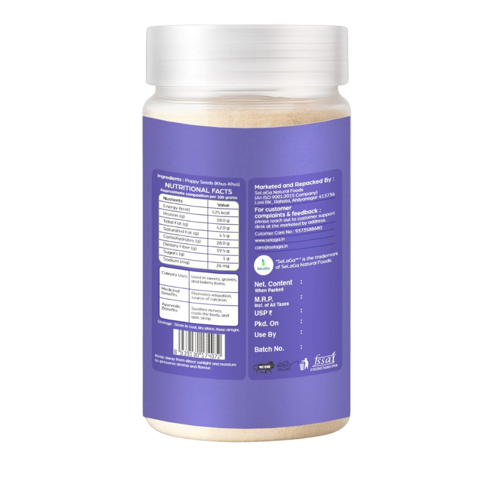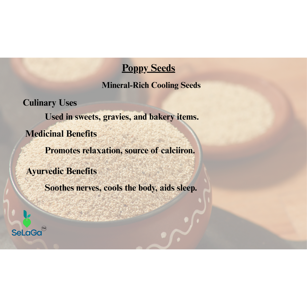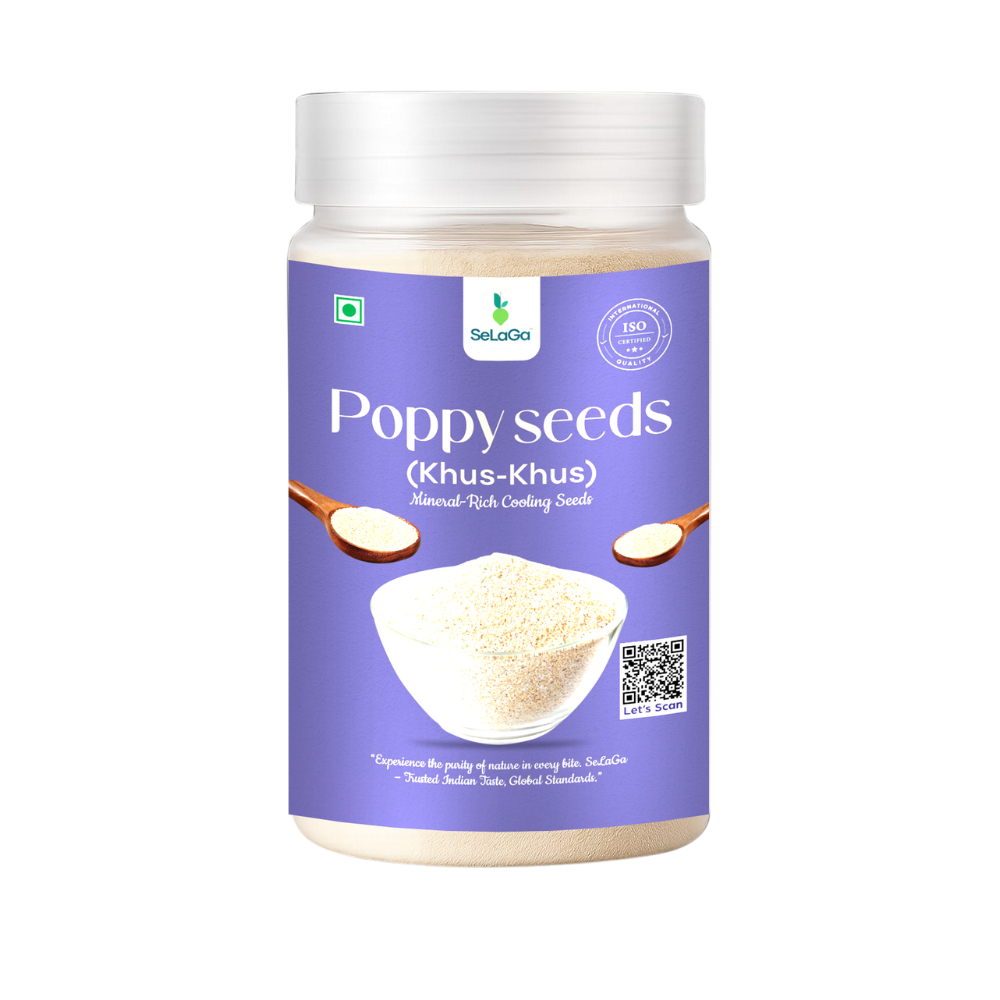 SeLaGa Premium Poppy Seeds (Khus Khus) – Fine, clean & naturally nutty seeds packed in a premium reusable jar. Ideal for thickening gravies, sweets, and traditional recipes. Rich in calcium, healthy fats & antioxidants for stronger bones, better sleep, and overall wellness.