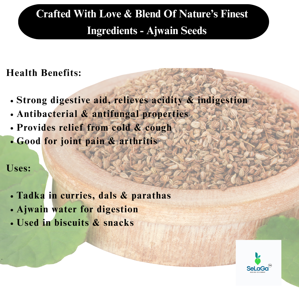 SeLaGa offers premium-quality Ajwain Seeds, naturally sourced, pure, and hygienically packed to retain freshness and medicinal value. They can be used in curries, parathas, snacks, pickles, and home remedies.