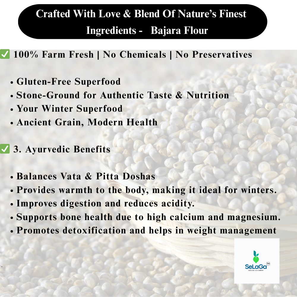 SeLaGa Pearl Millet Flour has a naturally earthy aroma and rich texture, making it perfect for preparing soft bajra rotis, bhakri, paratha, dosa, cheela, porridge, and healthy baked recipes. It blends well with other flours and can be easily incorporated into daily cooking.