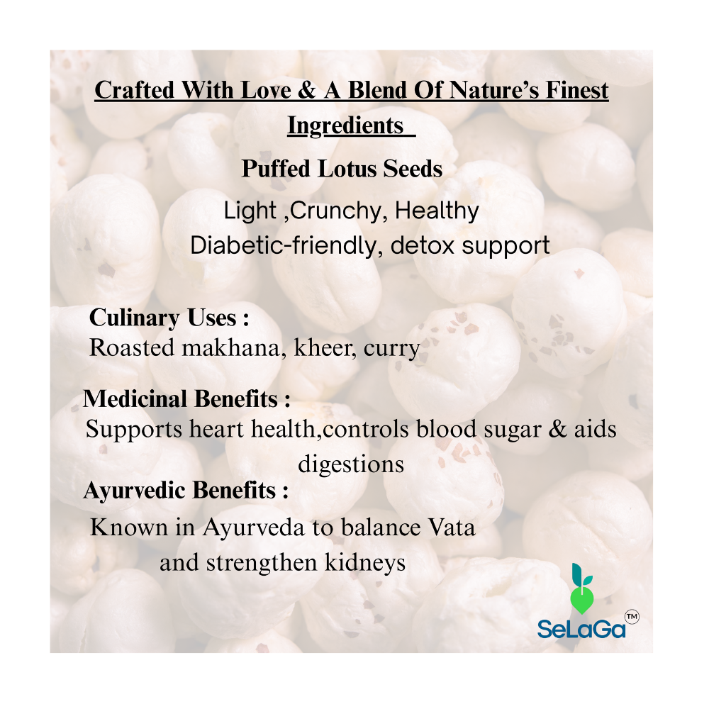 SeLaGa Premium Makhana (Lotus Seeds) offers a light, crunchy, protein-rich snack packed in a premium reusable jar. Naturally gluten-free, low in calories, and rich in antioxidants, these big-sized lotus seeds support heart health, weight management, digestion, and energy. Perfect for snacking, fasting, and healthy cooking.
