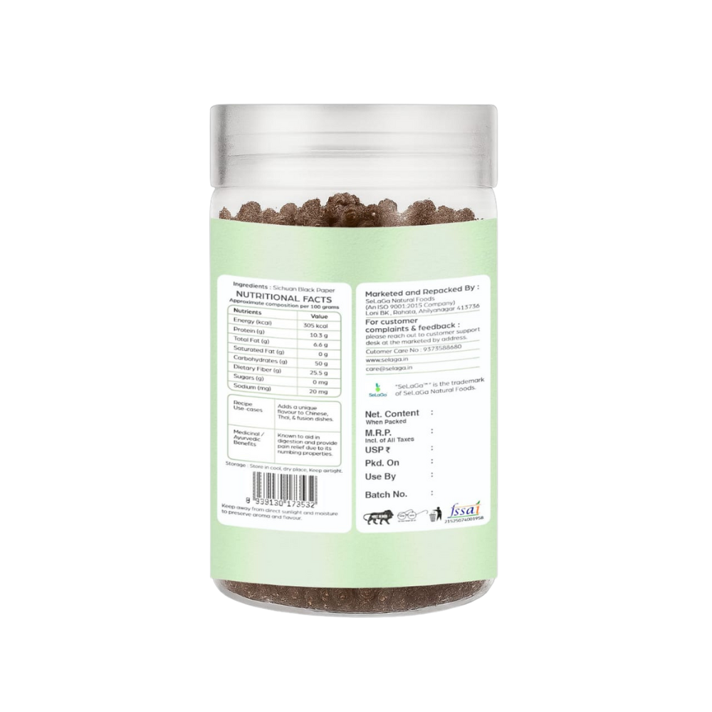 Experience the bold flavor of SeLaGa Sichuan Black Pepper โ€“ a unique spice known for its numbing, tingling, and citrusy taste. Widely used in Chinese and Tibetan cuisines, this premium spice is also packed with antioxidants and digestive benefits. Perfect for soups, stir-fries, curries, and chutneys, SeLaGa ensures 100% natural, preservative-free Sichuan pepper that delivers purity and freshness.